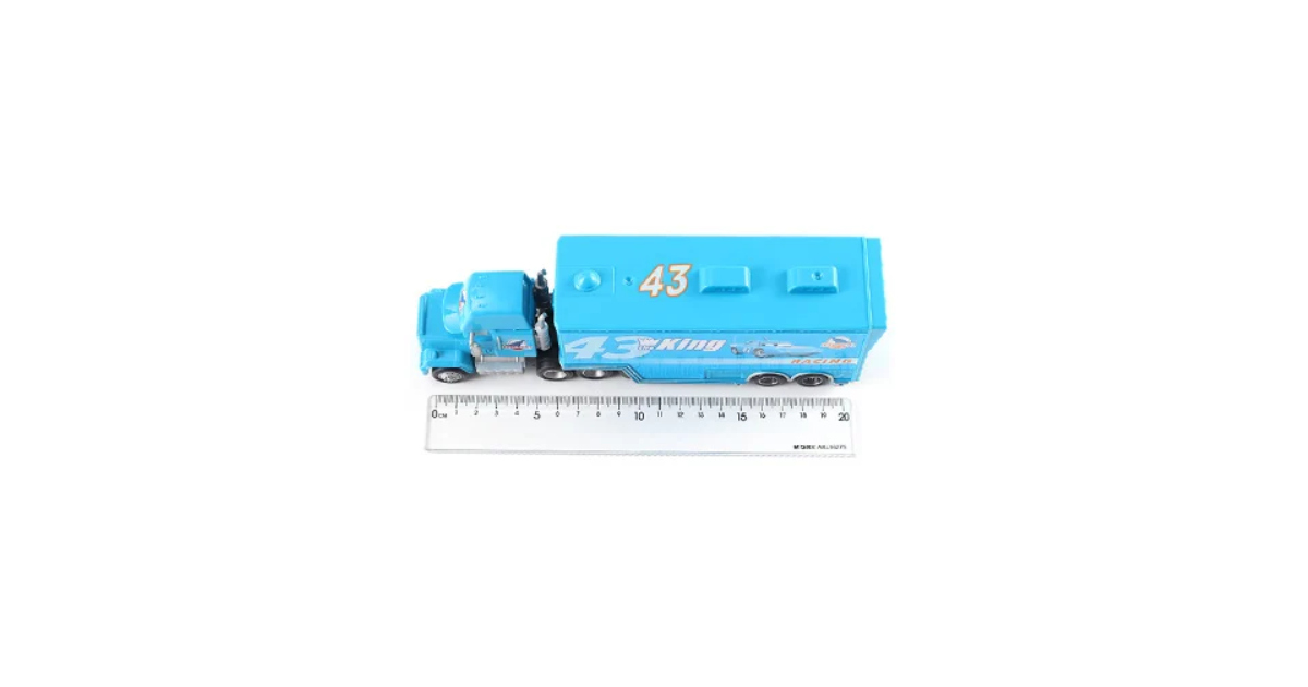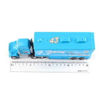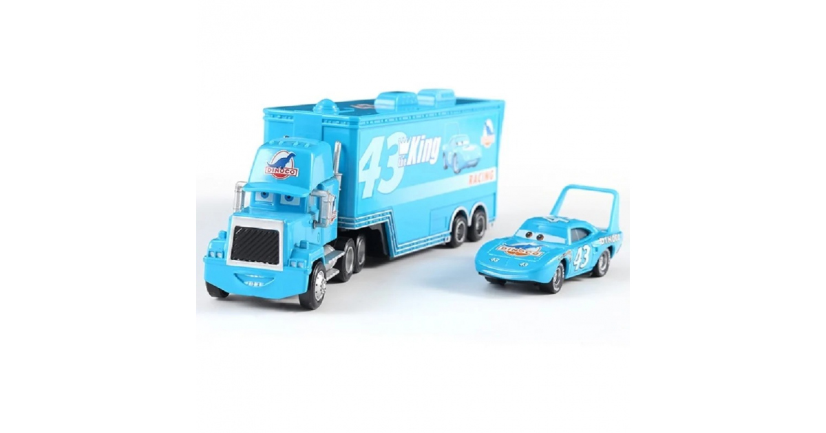 ¡Siente la adrenalina de Cars con el camión Mack azul transportando al rey de las pistas, The King #43 de Dinoco! Detalles fieles y divertidos para horas de juego épico.